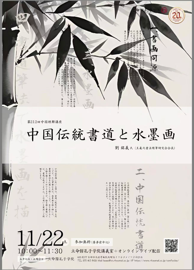 2025年11月22日,日本立命馆大学孔子学院举办了中国理解讲座“中国传统书法与水墨画”,讲师为著名书画学者、清华大学美术学院客座教授刘铭义先生。