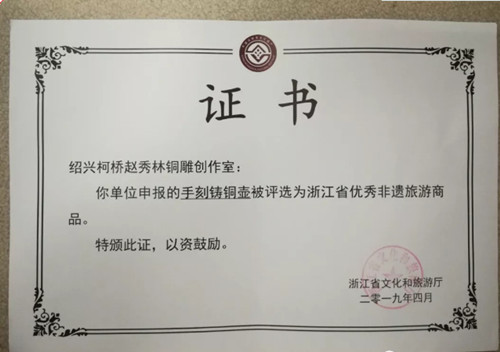 1.以“大师”的要求培养专业人才:通过各级部门、社团学校的推荐,近年来先后招收了王财、毛雅丽、孙萍萍等“入室弟子”近十名,以培养工艺大师的要求培养弟子。2018年8月,赵秀林师徒铜雕作品展在越国文化博物馆举行,师徒作品受到社会高度关注;2019年1月,传人赵刚荣获绍兴市工艺美术大师称号;2019年10月,弟子王财、孙萍萍、毛雅丽、陶卫荣、何永娟等五位弟子荣获“庆祝新中国成立70周年”绍兴市工艺美术精品展三金两银。