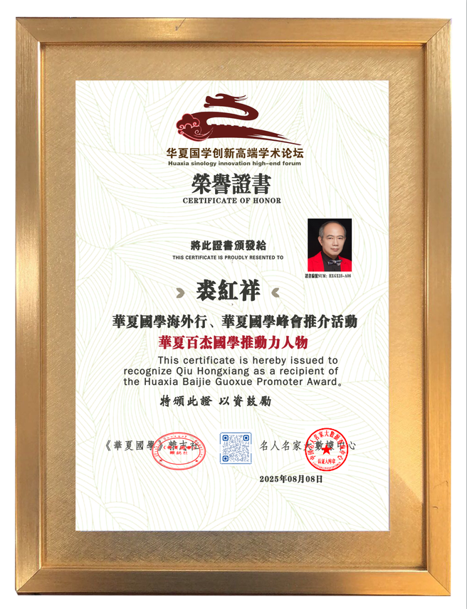 近日,从2025华夏百杰国学推动力人物推介组委会上传出喜讯,上海市社会经济文化交流协会副会长、北京易斯顿国学文化中心主任、当代著名国学文化研究学者裘红祥先生获得本届“华夏百杰国学推动力人物”大奖荣誉称号。2025年华夏百杰国学推动力人物推介组委会是由《华夏国学》杂志、中华国学海外行、华夏国学创新高端学术论坛等单位指导、联合主办的年度国学盛事。